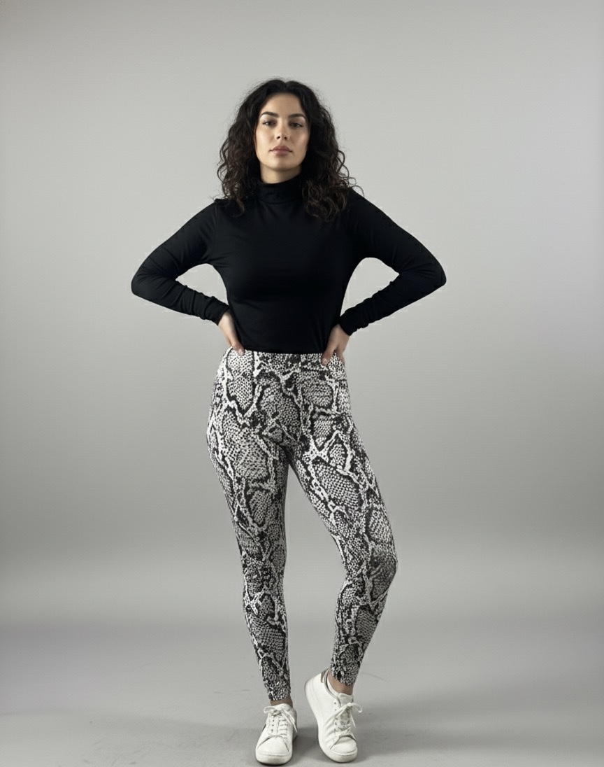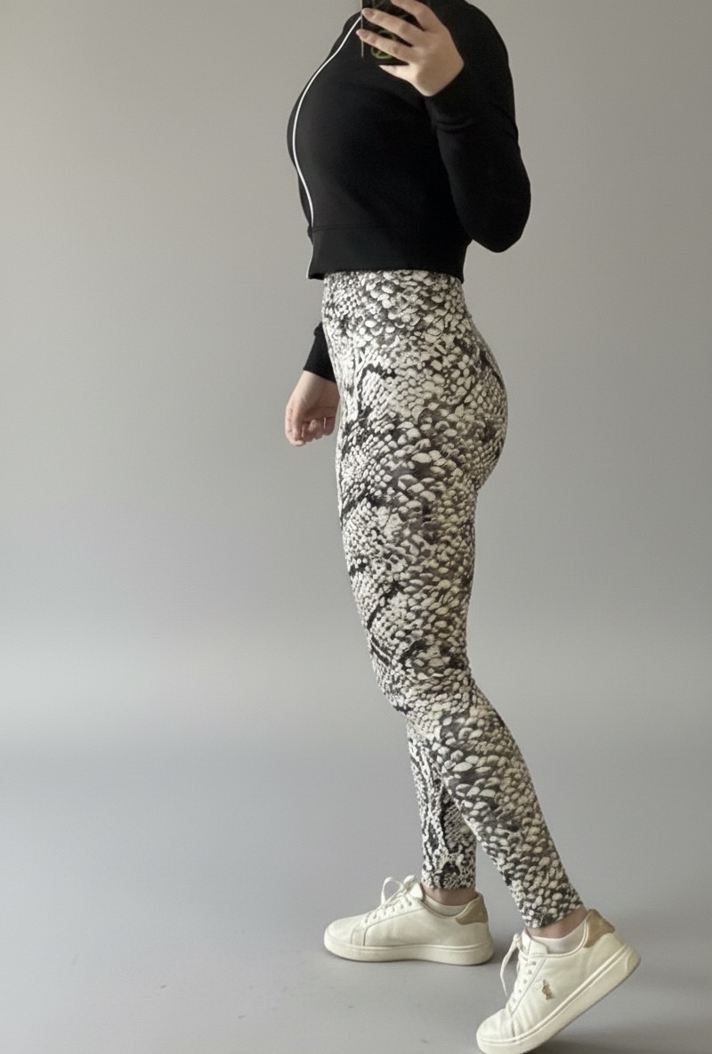 لِگ ورزشی زنانه با طرح پوست ماری، انتخابی ایدهآل برای ورزش، فعالیتهای روزمره و استایل خیابانی است. این لگ با پارچهای کشسان، سبک و تنفسپذیر تولید شده و آزادی حرکت کامل را هنگام تمرین فراهم میکند. ترکیب آن با یک سوییشرت سفید زیپدار و کلاه مشکی، استایلی شیک، اسپرت و مدرن میسازد.